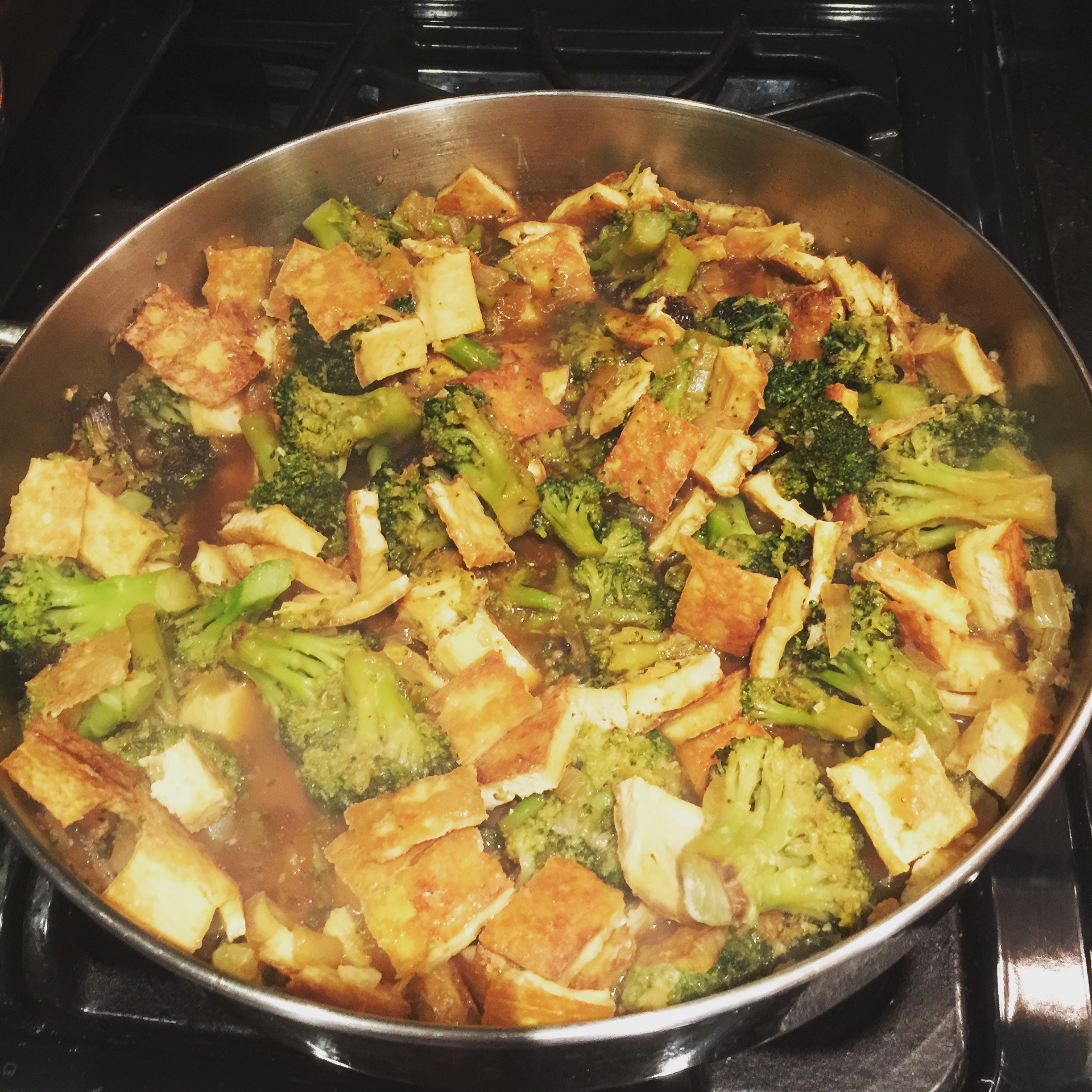 - By now the broccoli and tofu should be done. Add to the pan that the broth mixture is simmering in and toss to combine.